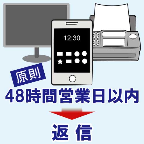 | お客様よりお見積りのご依頼をいただいてから、 原則48時間以内 にメール・お電話・FAXいずれかの方法で料金のご案内をさせていただきます。 |